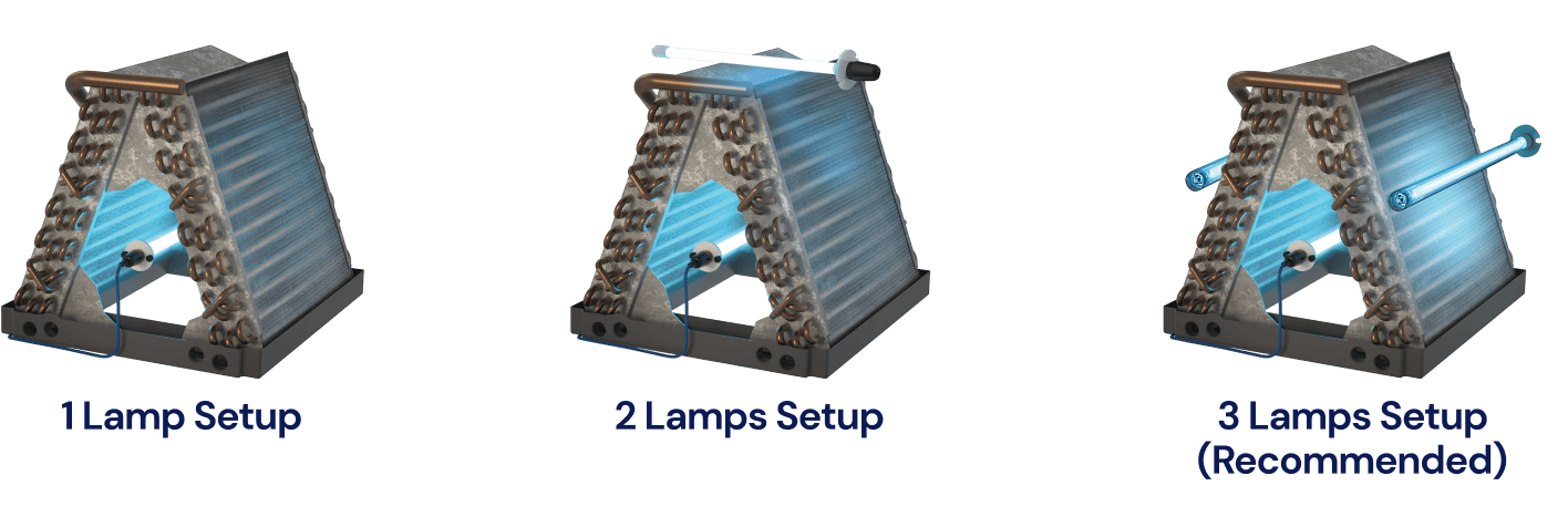 To ensure mold prevention in a typical HVAC system, it's recommended to install 2-3 UV lights. While even one light can provide benefits, multiple lights enhance effectiveness. If budget constraints arise, prioritize placing the UV light on the bottom side of the coil where organic material tends to accumulate—the source of mold growth. This placement ensures 100% coverage of the coil, leveraging the UV light's 3-5 inch kill radius to effectively neutralize mold and bacteria.(show an image here of 3 UV lights on a coil)